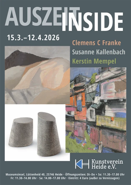 Unter dem Titel „Auszeit – Inside (Artists In Residencies Unlimited)“ werden die Künstler Susanne Kallenbach, Kerstin Mempel und Clemens Franke ihre Werke in der Museumsinsel, Lüttenheid 40 in Heide, präsentieren. Die Arbeiten sind bei der Teilnahme an verschiedenen Symposien und Künstlerresidenzen weltweit und auf gemeinsamen Reisen entstanden.